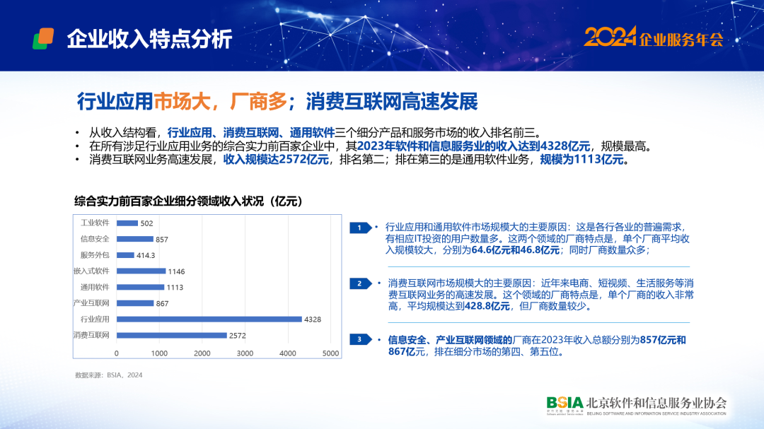 从区域分布来看,海淀依然保持主导地位,共有69家。其次为朝阳6家,昌平、大兴、丰台各有4家。从头部领先者区域分布来看,海淀聚集超6成的企业头部企业,优势地位明显。报告对企业运营的状况进行了深入分析。报告数据表明,综合实力前百家企业收入集中度高,头部领先者占据绝对主导。综合实力前百家企业2023年软件和信息服务业总收入为7073.5亿元,头部领先者占据了81.63%的收入;实力突出者占13.51%,中坚优秀者只占4.86%。从收入结构来看,行业应用产品和服务、消费互联网、通用软件产品三个细分产品和服务市场获得的收入排名前三。行业应用和通用软件市场的特点是,单个厂商平均收入规模较大,分别为64.6亿元和46.8亿元,同时厂商数量众多;而消费互联网市场规模大的主要原因在于近年来电商、短视频、生活服务等消费互联网业务的高速发展。这个领域的特点是,单个厂商的软件和信息服务业收入都非常高,平均规模达到428.8亿元,但厂商数量较少。