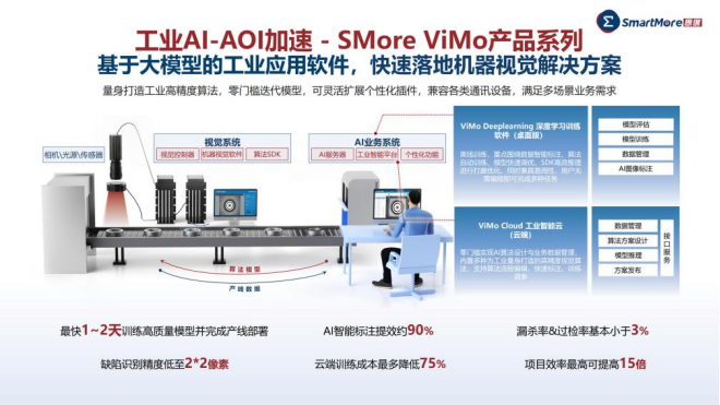 思谋智能通过核心算法建立高精度可通用的工业AI视觉检测分析模型平台,为制造业打造从供料入库、来料检测、产线生产、质量检测到出库发货的生产制造全流程AI 智能解决方案。平台在数据质量、通用大模型和轻量化平台三个方面实现了技术创新。平台使用了自动化数据清洗、数据增强等技术来提升工业数据质量;并通过AIGC技术生成多样的缺陷表征,用于补充收集到数据当中罕见的缺陷,辅助解决小样本、零样本问题。同时平台采用的工业通用理解大模型使平台具备通用理解和跨领域缺陷识别能力。最后平台采用轻量化压缩方法,更加适用于工业场景中的实际使用习惯。结合智能制造场景中的切实需求,打造相关智能硬件,为高端智能设备提供核心技术。